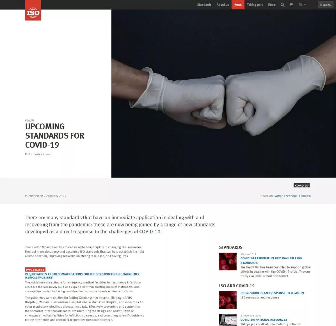 在此新冠肺炎疫情持續(xù)蔓延、亟待國際合作共同抗擊疫情之際,IWA 38《應(yīng)急醫(yī)療設(shè)施建設(shè)導(dǎo)則》作為ISO應(yīng)對新冠肺炎疫情的系列標準之一先行發(fā)布,為世界各國安全、適用、快速建設(shè)應(yīng)急醫(yī)療設(shè)施提供了有力的技術(shù)支持,為中國乃至世界人類健康事業(yè)作出了巨大的貢獻。
