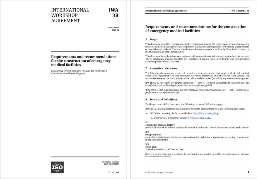2021年12月20日,國際標準化組織(ISO)官方網(wǎng)站正式發(fā)布了中國中元牽頭提出的國際研討會協(xié)議IWA 38《應(yīng)急醫(yī)療設(shè)施建設(shè)導(dǎo)則》(以下簡稱“《導(dǎo)則》”)。